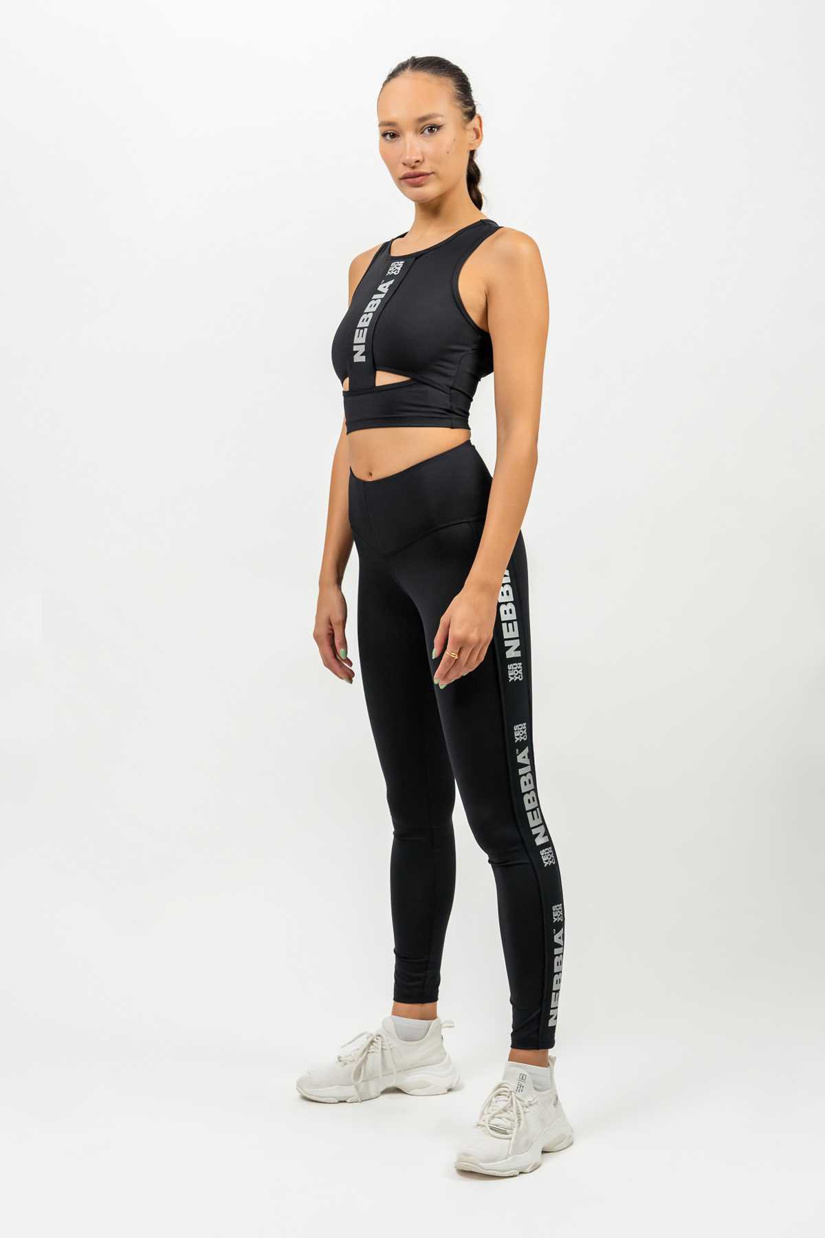 We have combined all our knowledge to create the perfect leggings! The high-waisted cut will beautifully accentuate your slim waist and support your abdominal muscles, while the sophisticated seams and material properties will shape your thighs and butt. The black leggings also provide the popular “scrunch butt” effect, which accentuates the shape of the butt, and the iconic NEBBIA leggings on the sides draw a nice leg line.